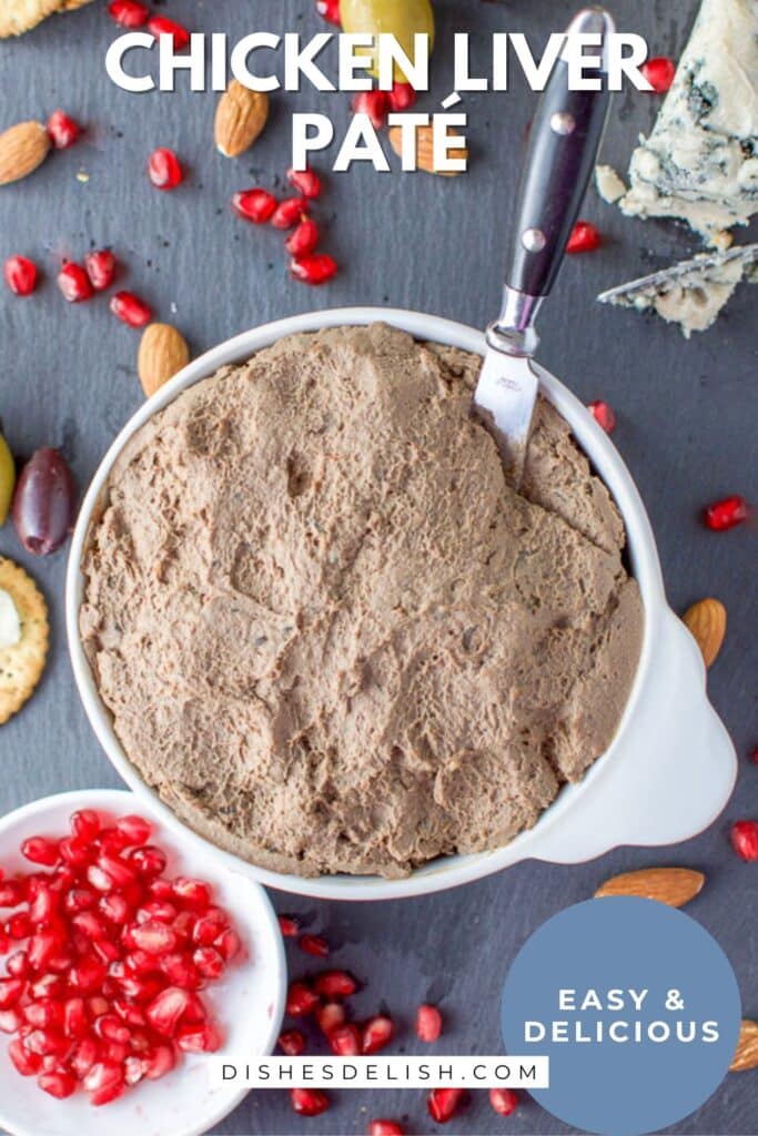 Scoop the chicken liver pate into a serving bowl and add other appetizers like cheese, crackers, pomegranate seeds, olives and almonds.